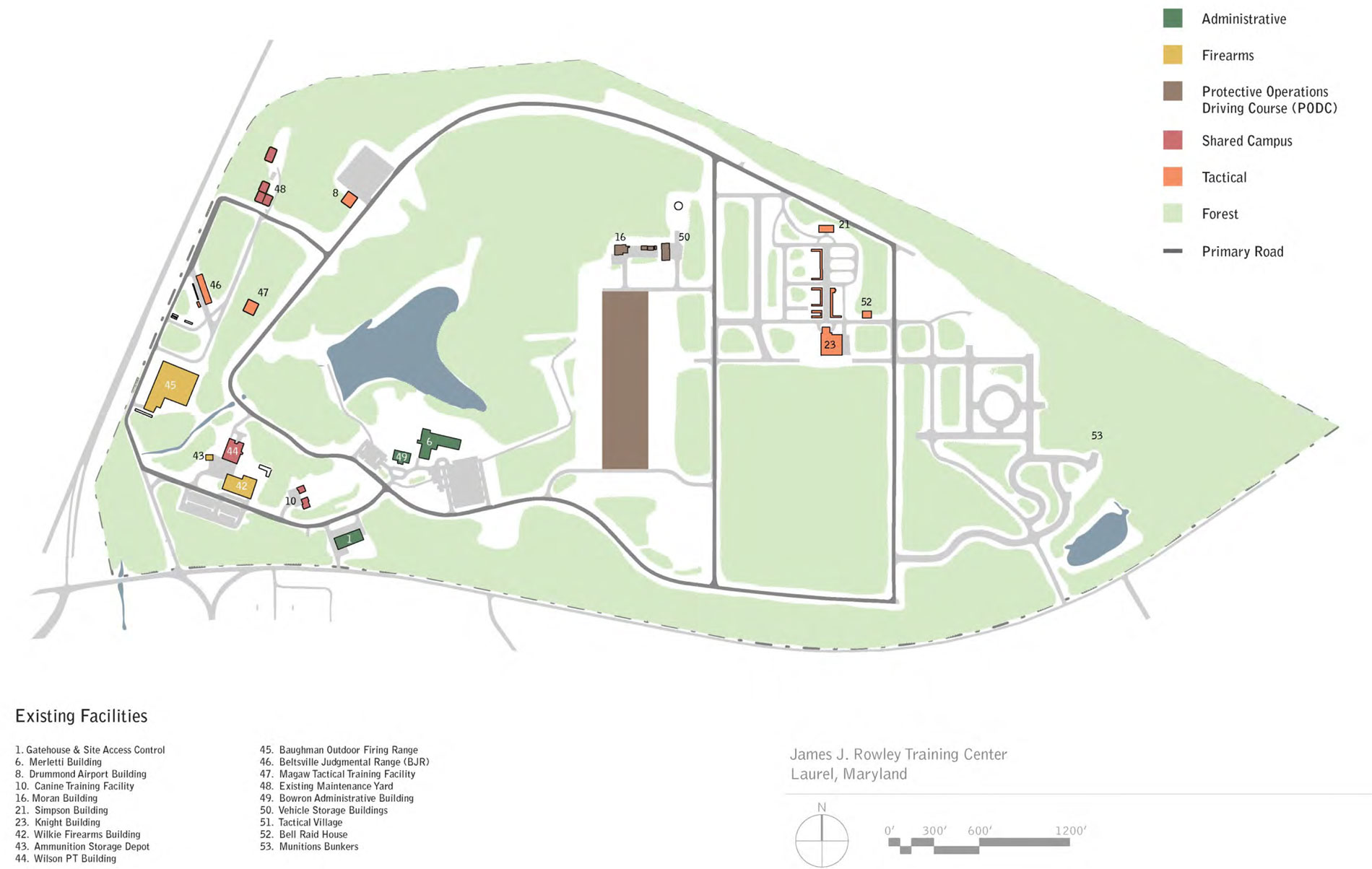 Located just outside of Washington, D.C., the Rowley Training Center (RTC) is comprised of 493 acres of land, six miles of roadway and 37 buildings. This elite classified complex comes equipped with high and low speed driving courses; indoor and outdoor firing ranges; a close quarters tactical range building (shoot house); a mock "Beltsville Field Office"; a raid house; a moot courtroom; a canine training facility; a cover course; a 250,000 gallon indoor water safety training tank, a physical fitness center, multiple classrooms, and two tactical villages. Mock-ups of Air Force One and Marine One are parked nearby. View the Rowley Training Center map.